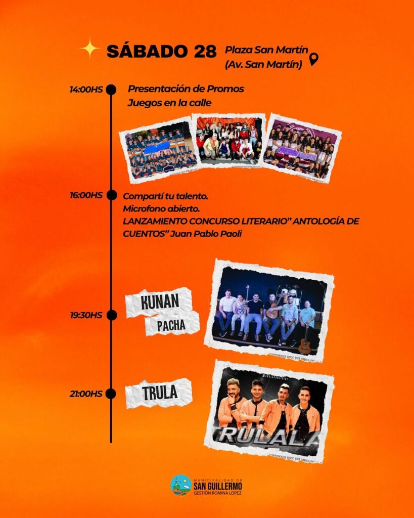 Por último, el sábado es el turno de las Promos y por ello se desarrollarán actividades en la Plaza San Martin. A partir de las 14 habrá juegos en inmediaciones a la plaza, a las 16hs comenzará el concurso «Compartí tu talento» (inscribite aquí) y la presentación del concurso literario «Antologías de cuentos». A las 19 hs sonará Kunan Pacha con todo el Folklore y a las 21 hs hará bailar a todos los sanguillerminos la clásica banda cuartetera Trulalá. La entrada es libre y gratuita.