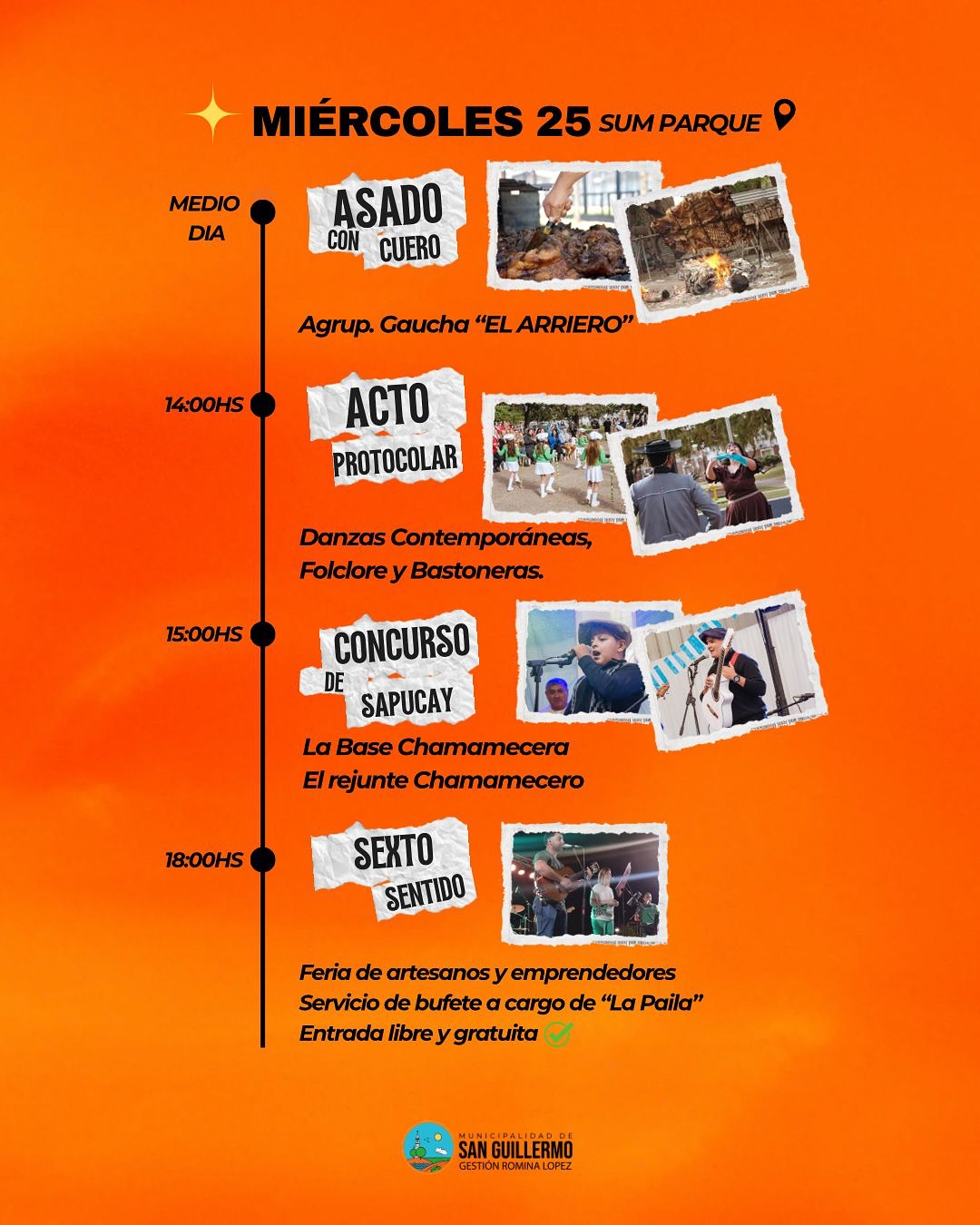 El mismo miércoles 25, el día del Santo Patrono que da nombre a nuestra ciudad, La Agrupación Gaucha realizará la venta de asado con cuero en inmediaciones del Salón de Usos Múltiples (SUM) del Parque Municipal Alfonsina Storni. A las 14hs, en el SUM se realizará el acto protocolar y las 15 se dará inicio al concurso de Sapucay «Reynaldo Filippi» (inscribite aquí). Para concluir la jornada de entre semana, Sexto sentido sonará con un repertorio único mientras se desarrollará una feria de artesanos. El buffet estará a cargo del Taller Protegido La Paila. La entrada es libre y gratuita.