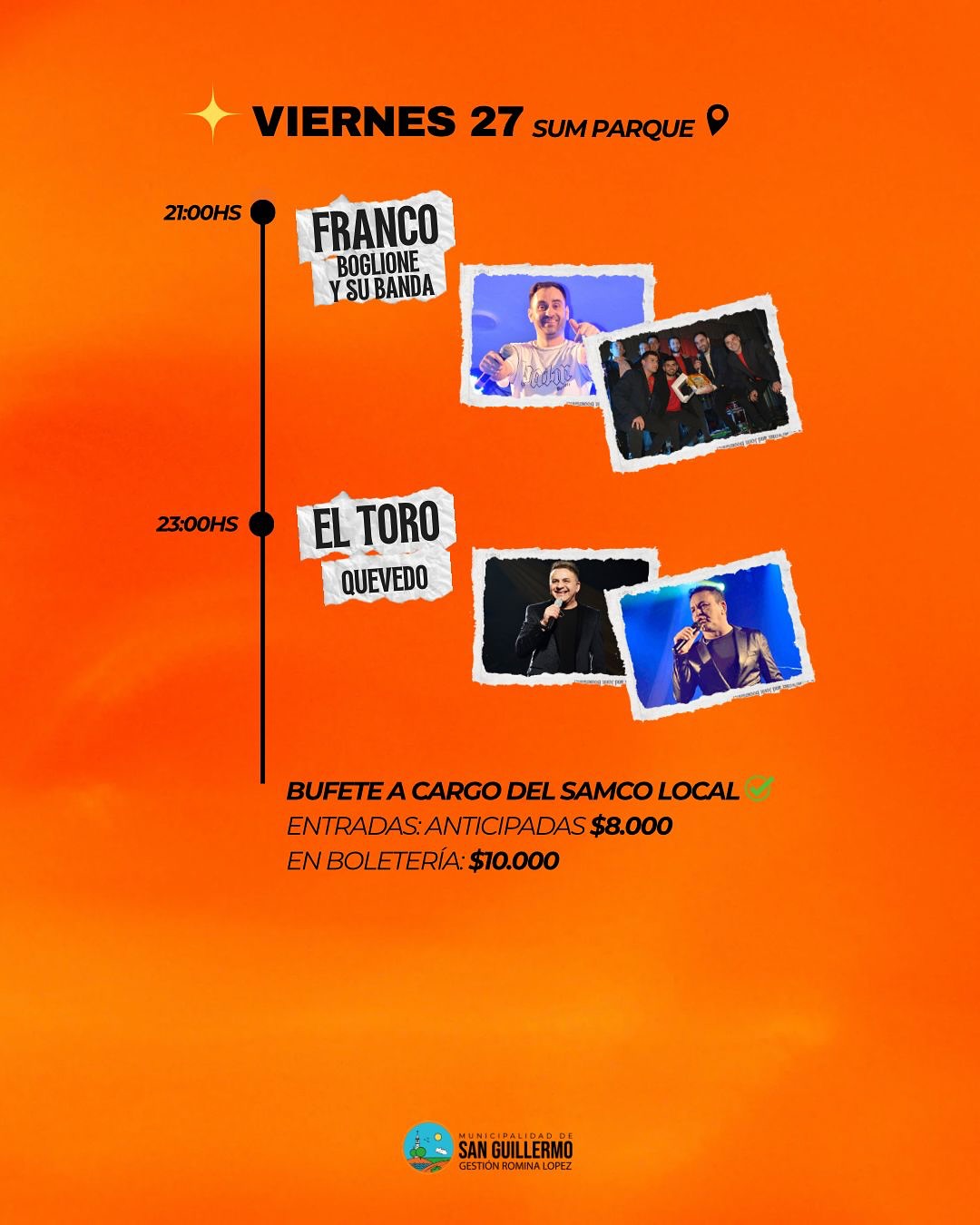 Por su parte, el viernes nos deslumbrarán con su música Franco Boglione y su banda y el cordobès Toro Quevedo. La cita nuevamente será en el SUM del Parque Municipal pero esta vez la entrada tendrá un costo de (8 mil las anticipadas y 10 mil en boletería) .