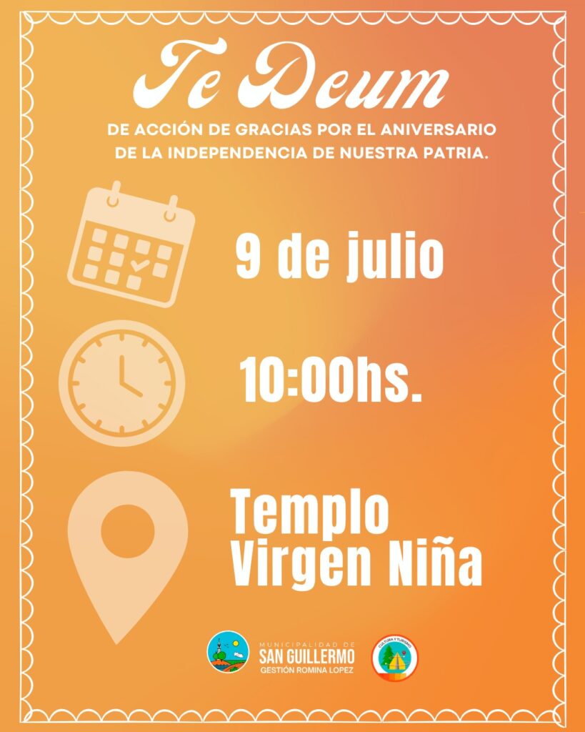Una fecha Patria que de seguro nos enorgullece es el 9 de Julio, aquel evento en el que 29 congresistas firmaron la declaración de la independencia de las Provincias Unidas del Río de la Plata del Reinado de Fernando VII, su sucesores y cualquier otro reinado. Por todo esto, la Municipalidad de San Guillermo en conjunto con la Iglesia Católica han decidido realizar el Te Deum para esta fecha: se trata de misa especial en la que el espíritu reinante es la gratitud por los hechos acontecidos que hoy nos llevaron a ser la Nación libre e independiente que somos.