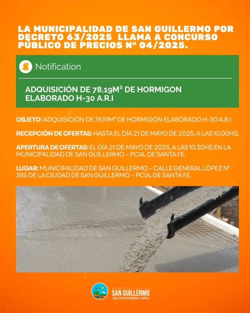 Al respecto, la intendente Romina Lopez promulgó el Decreto 63/2025 por el cual convoca a la realización de un concurso público para la adquisición de 78,19 metros cúbicos de Hormigón Elaborado H-30 A.R.I.. En dicho decreto se adjuntan también los plazos y requisitos a cumplir. Descargalo aquí.
